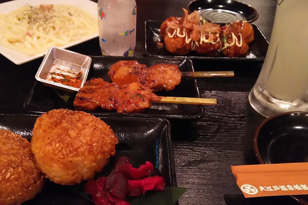 たこ焼きと焼き鳥、焼きおにぎりにカルボナーラ味のうどんと酎ハイでトマトちゃんはラムネ飲んでました♪