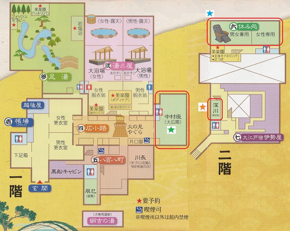館内マップです赤枠で囲った★★★は仮眠スペースになります。