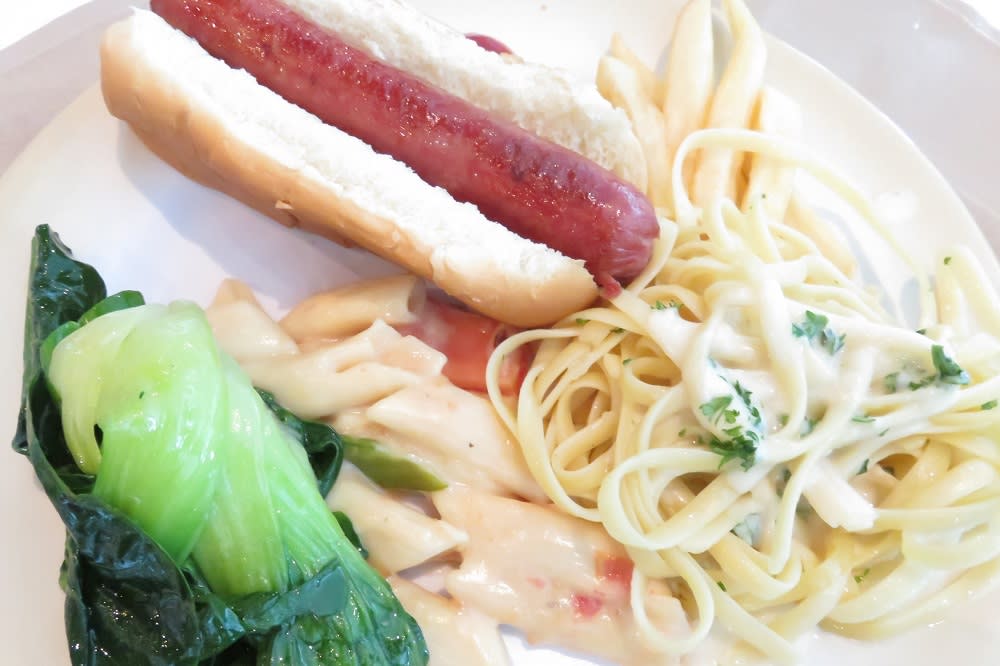お昼ごはんは、2種類のパスタとホットドック。