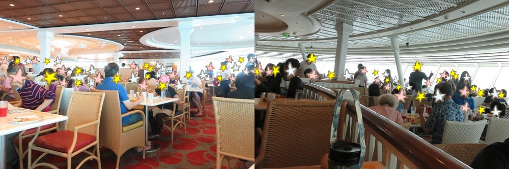 hiro1967: 「★ウインジャマーカフェには入場制限がある 他の地域のクルーズは分かりませんけど…。 香港発着ボイジャーのウインジャマーカフェはいつも混雑していました。 座れない人がないように、一定の人数がレストランから出て同じ人数が入るよう入口で人数調整していましたョ。d(゜-^*) 入口で右に行ってとか左に行ってとか言われて、その通りに向かいますが、席はなかなか見つけられません。・・(゜∀゜ll)。o(ワラットコ) ★持っていると良い物~ウエットティッシュ (*^▽^*)ノヨカッタラト゛ウソ゛ ブッフェレストランのクルーは、空いた席を(気の毒なくらい…)せっせと綺麗にしてくれてるんですが、整うのを待っていられない場合もあるし。 食後のテーブルはアジアの中華街のフードコートとか想像していただけると… ウエットティッシュを持ってると役に立つと思います。(´∀`;A トマトちゃんは、必ずナプキンを1枚多く持って来てテーブルに敷いていましたョ。」