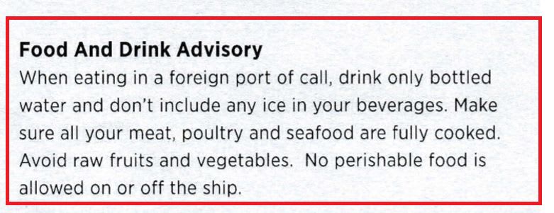 ・外国の寄港地で食べるときは、ボトル入りの水だけを飲み、飲み物に氷を入れないでください。