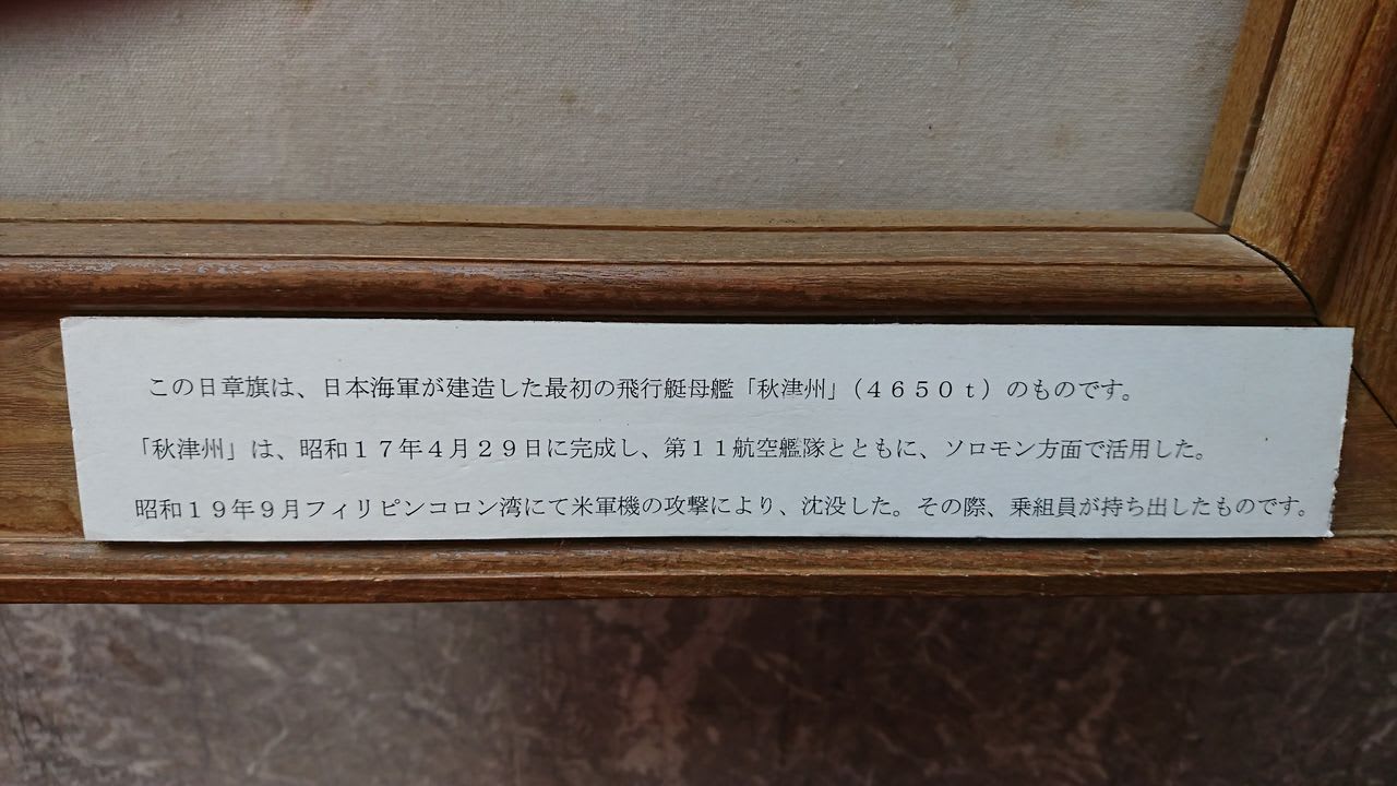 『この日章旗は、日本海軍が建造した最初の飛行艇母艦「秋津州」(4650t)のものです。』