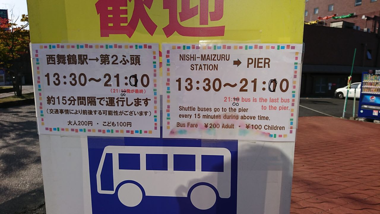 さて、一通り見学も終え、バスに乗り西舞鶴に戻ったところで、いい時間になってきたため、駅前から出ている港へのシャトルバスに乗って乗船場所まで移動します。