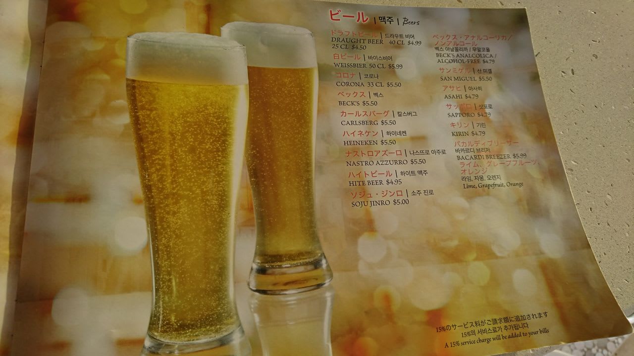 各メニューのお値段に、+15%のサービス料が加算されます。飲み放題プランは「サービス料を加算した後の金額」が12ドル以下のものに対して適用されます。