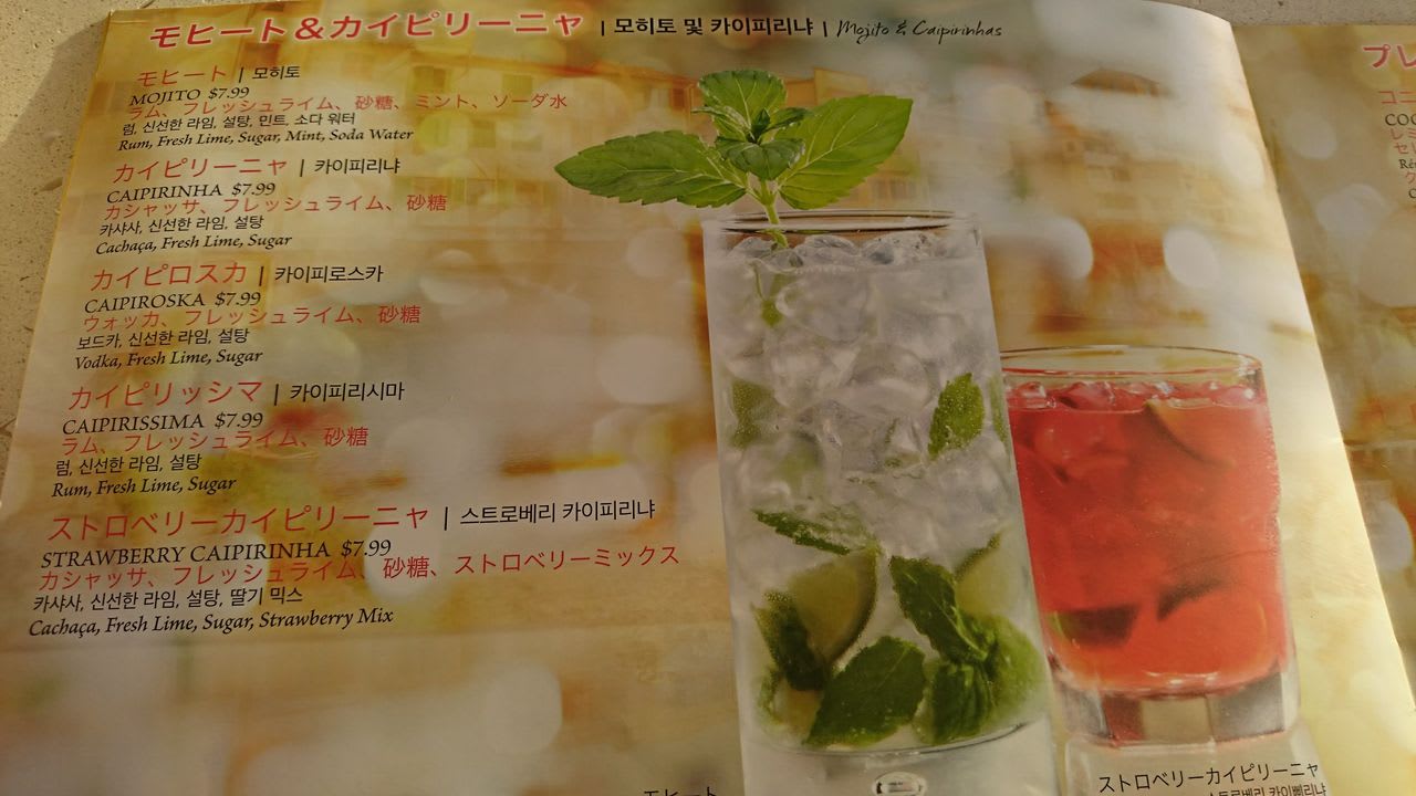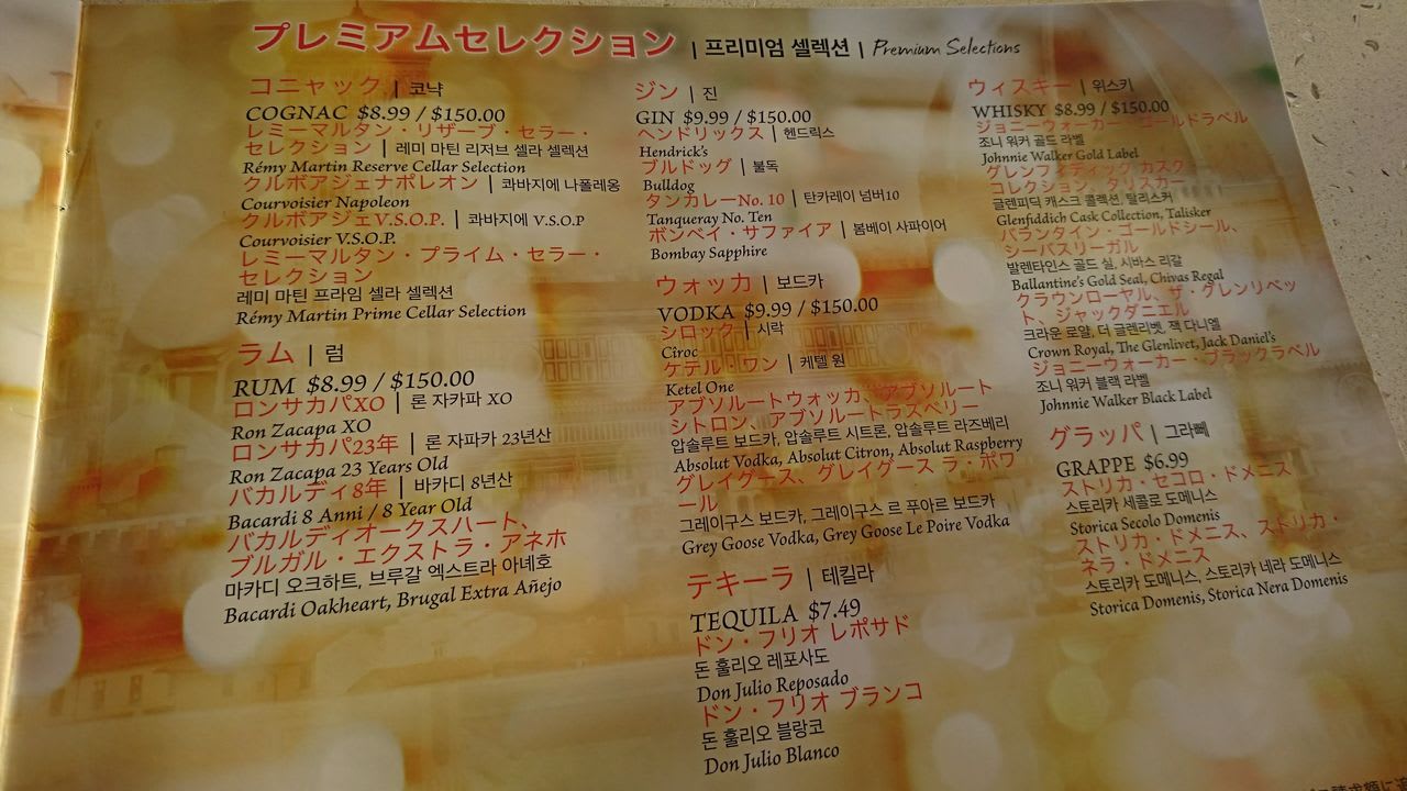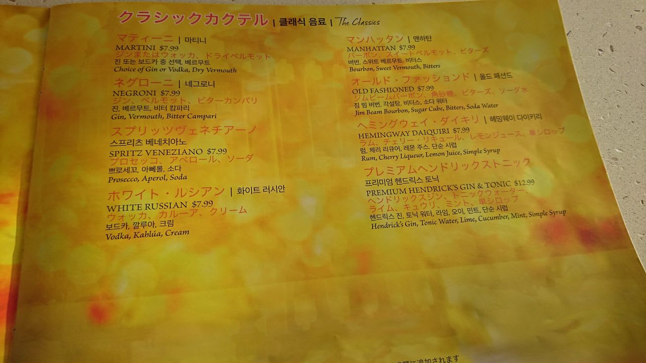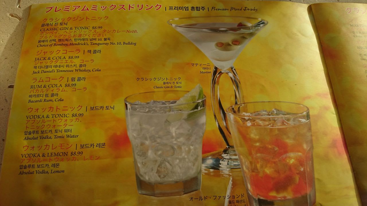 せっかく飲み物飲み放題プランになっているので、ウェルカムドリンク代わりに1杯飲んでみましょうか。バーにいるスタッフはほとんどがアジア系の外国人スタッフなので、日本語はあまり通じませんが、スタッフも日本人に慣れてる感じだったので、英語がしゃべれなくてもメニューを指で指し示せば問題なさそうな感じ。