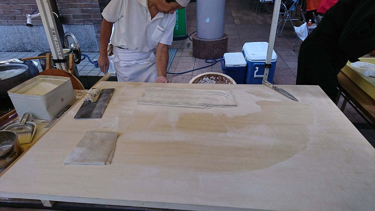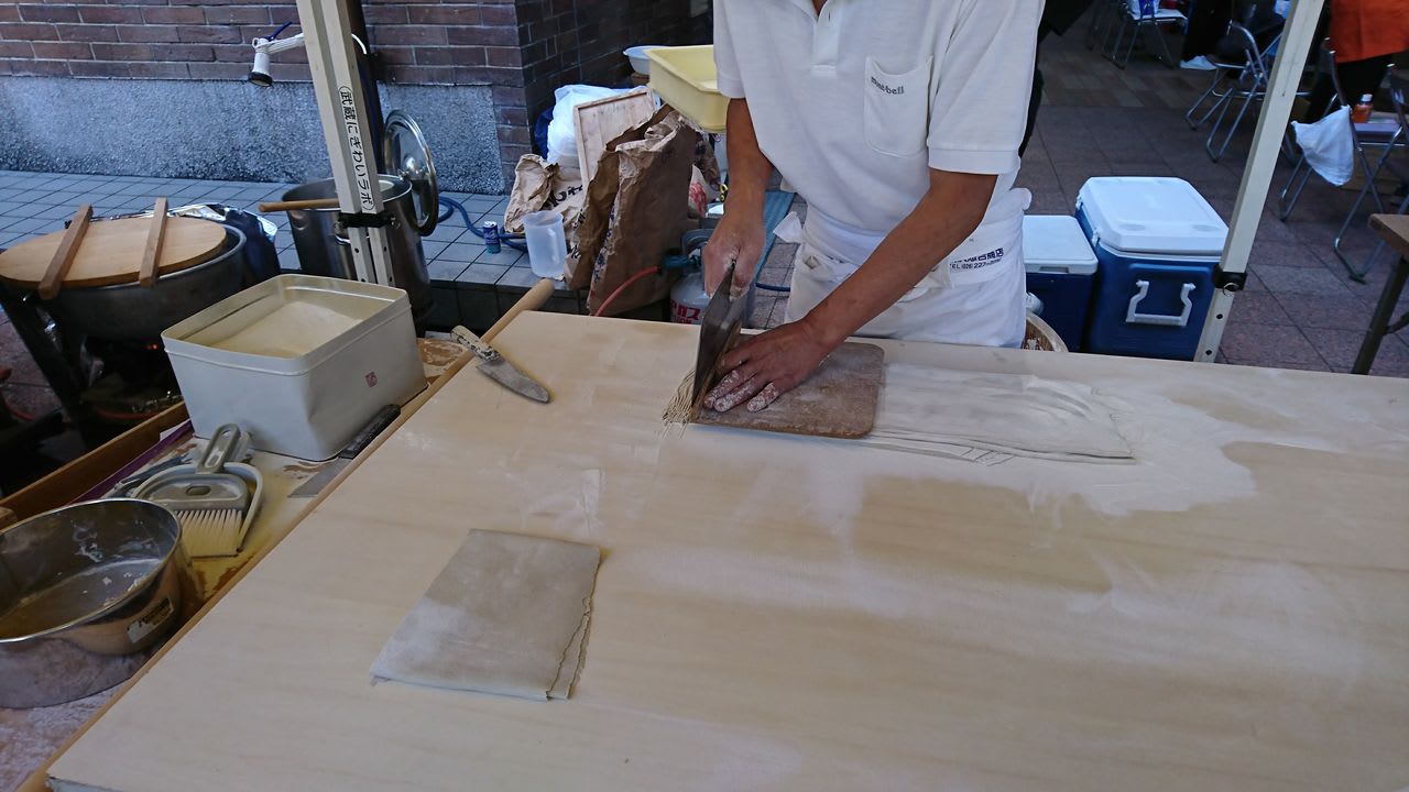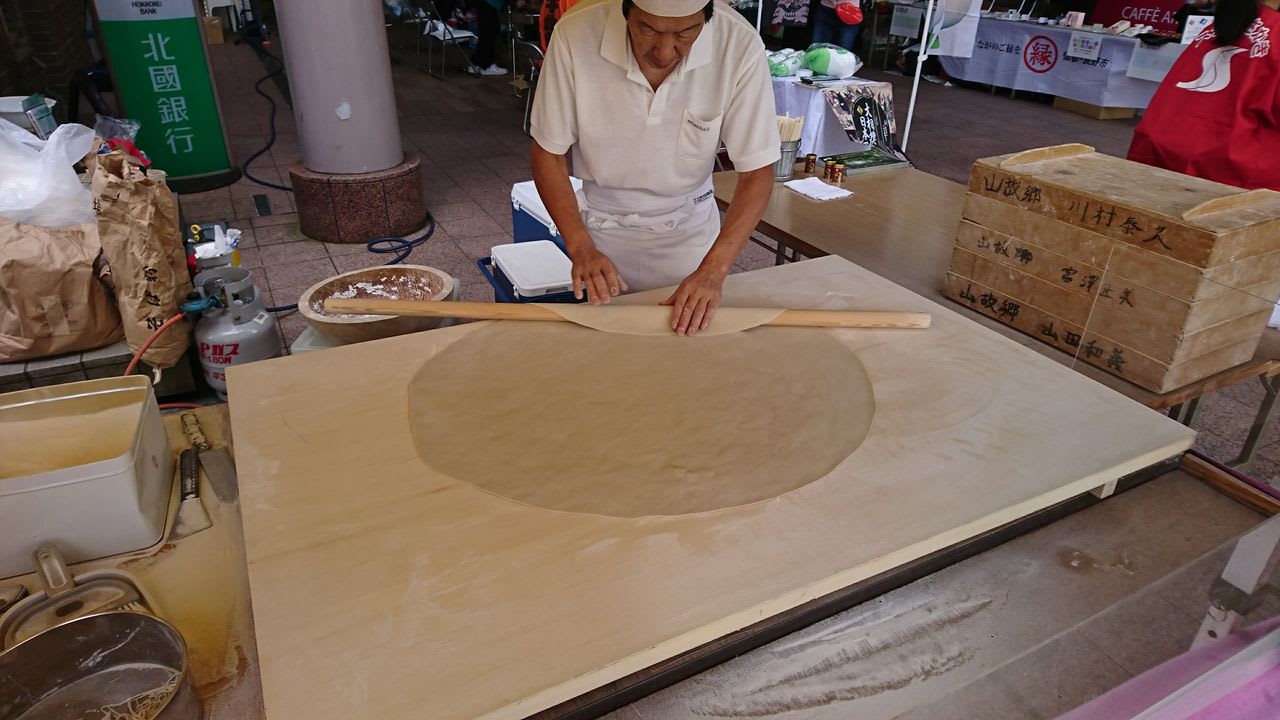 その他にも、市場の入り口のところに信州からの観光PRのために、蕎麦うちの実演をしている場所を発見。熟練の手並みであっという間に蕎麦ができていきます。