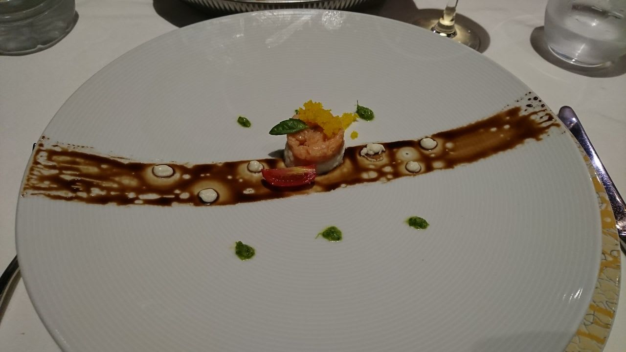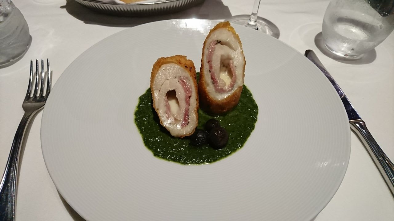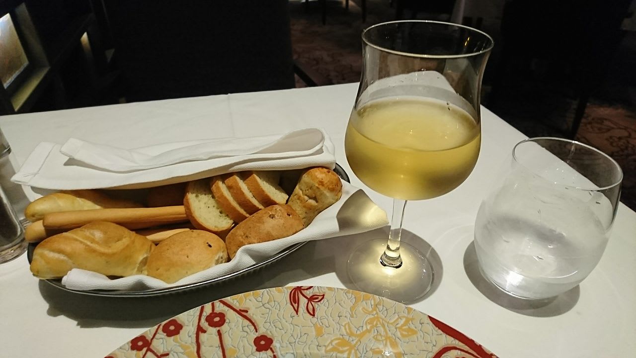 席について飲み物を聞かれるので、ドリンクパッケージに含まれるお値段の白ワインをグラスで注文。銘柄とかよくわからないのでそこはご了承ください。