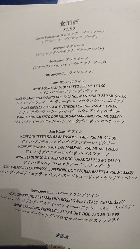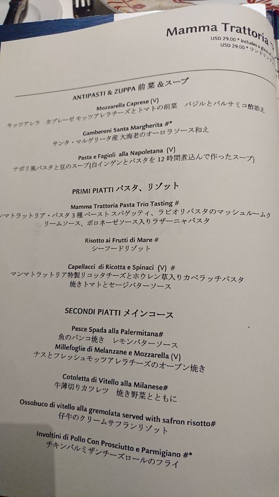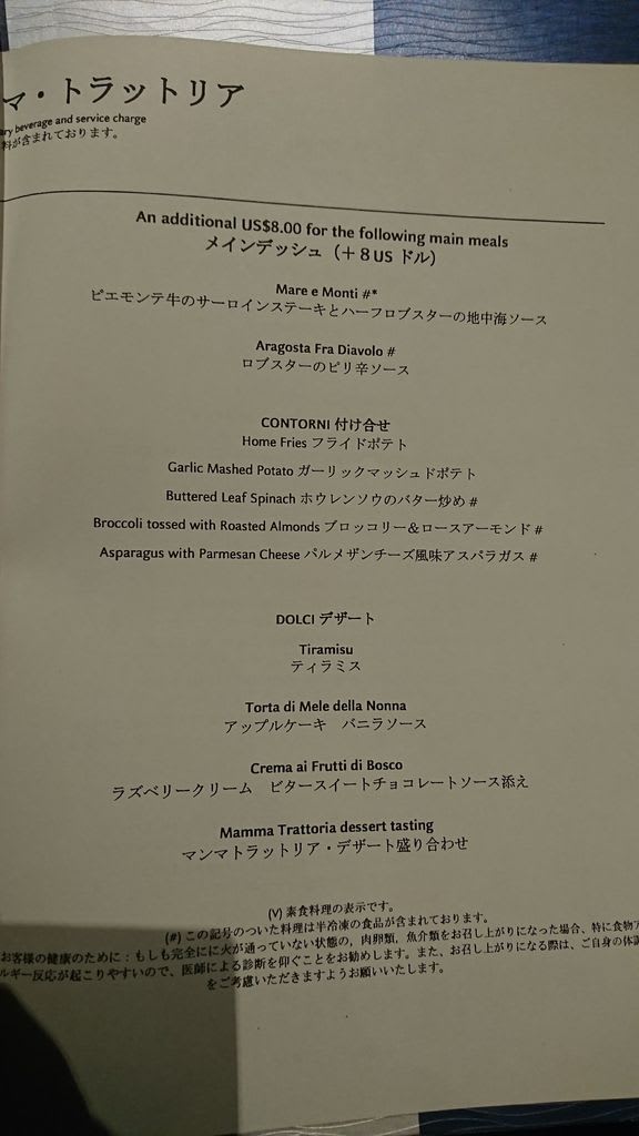 ※2018年のクルーズから「マンマ・トラットリア」がリニューアルされ「リストランテ・カサノヴァ」と名前が変わり、お値段は39ドルになったようです。その代わり、3つ星シェフによるイタリアンが楽しめるようになったとのこと!!これは再乗船しなくちゃいけないですね!!(笑)