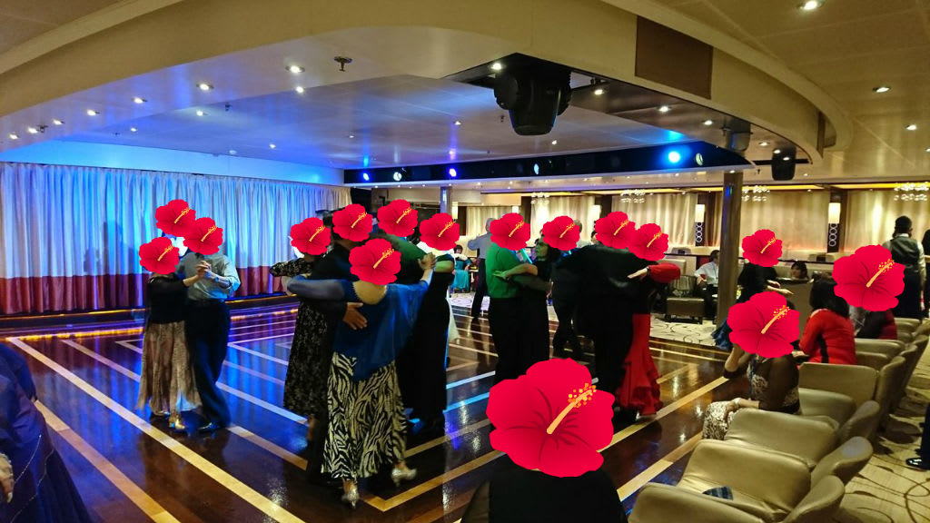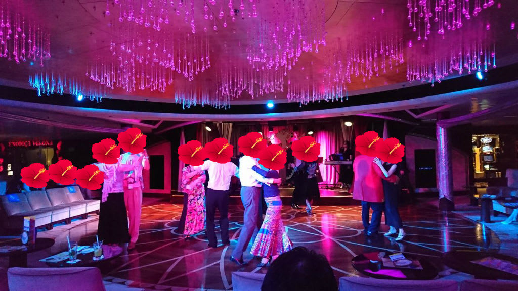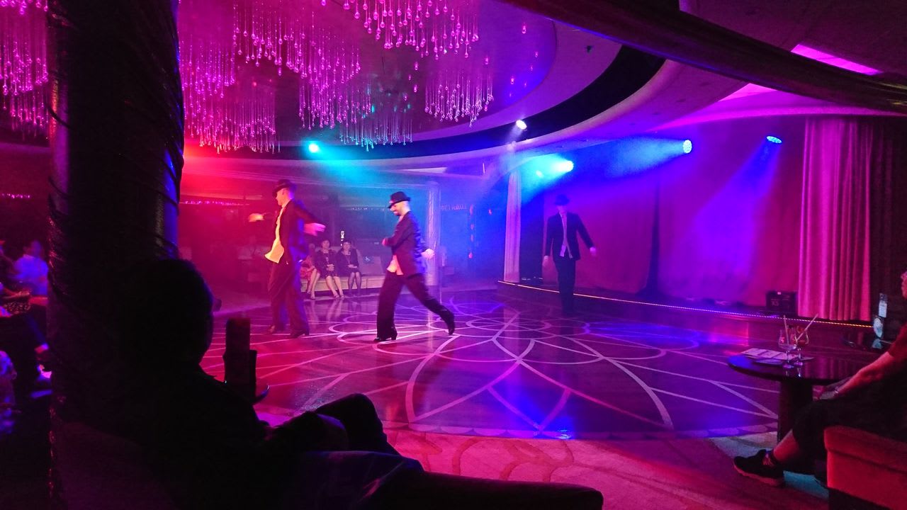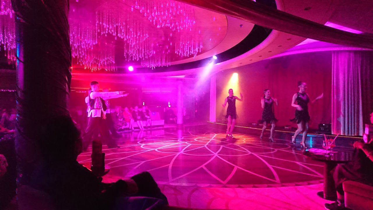 さて、ビンゴ大会が終わった後は、デッキ9の「キャバレー・ビエンナ」にてダンスショーを鑑賞します。コスタ・ネオロマンチカにはステージ付きのホールなどはないのですが、その分、パフォーマンスが目の前で楽しめるのはいいなと思いました。と言っても他の船に実際に乗ったことはないんですけどね・・・。