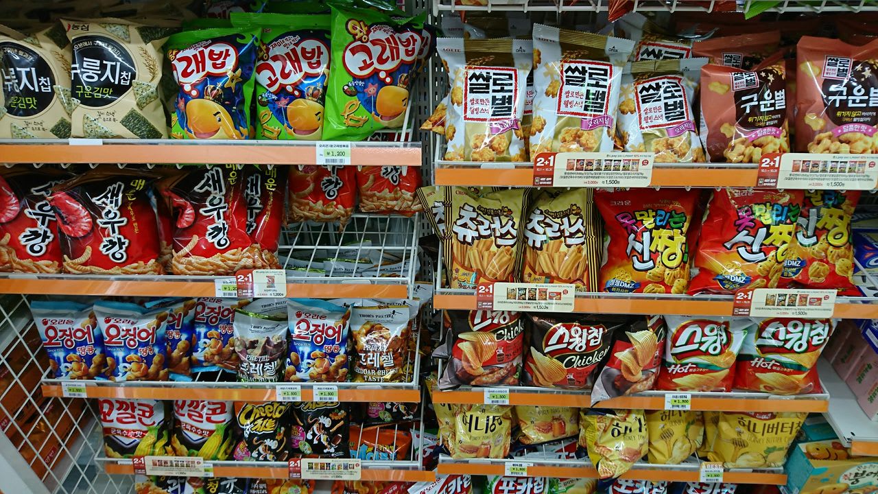 商品棚を見てみると、どこもかしこもハングル文字!!(あたりまえ)