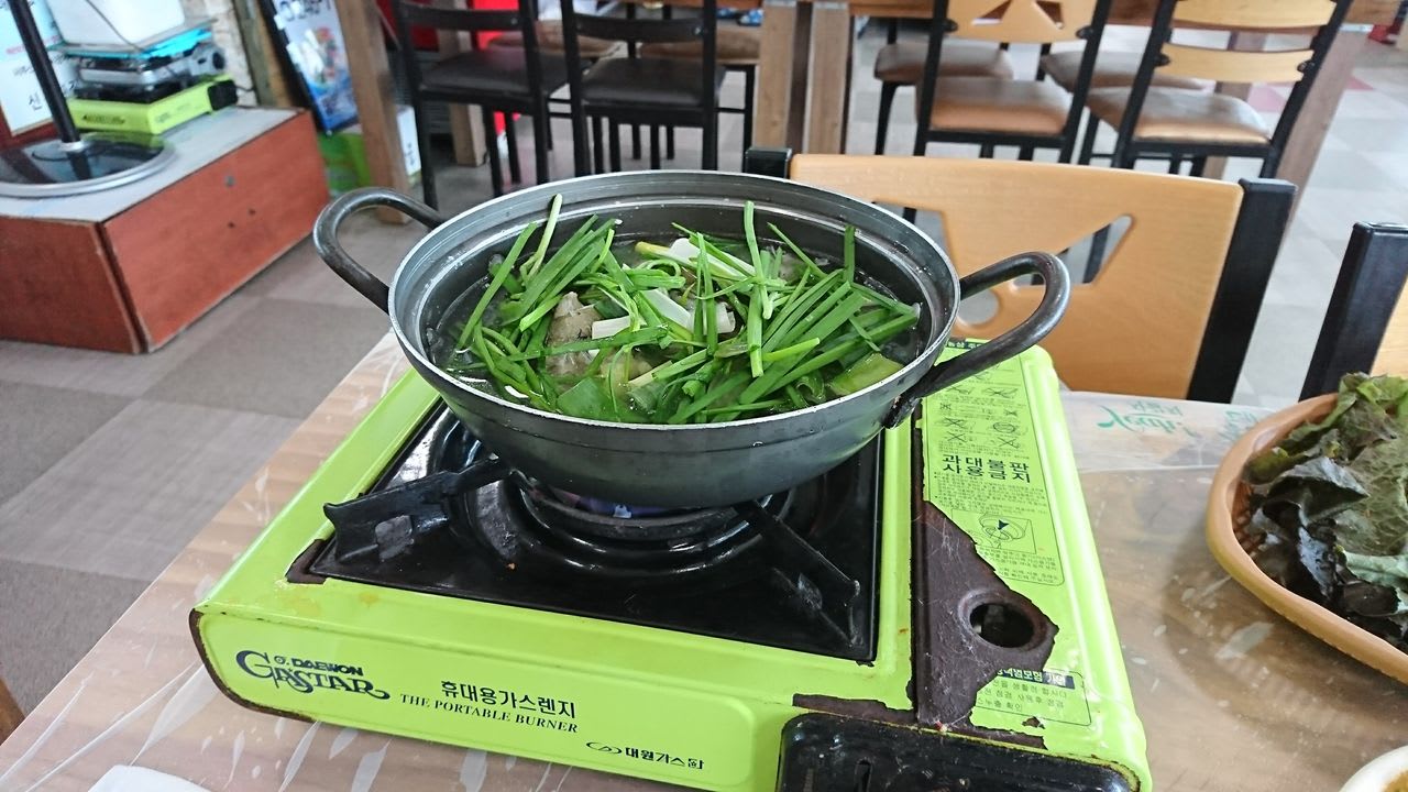 一緒に出てきた鍋物は、潮汁のような塩味のスープに魚の切り身とニラがたくさん!!!