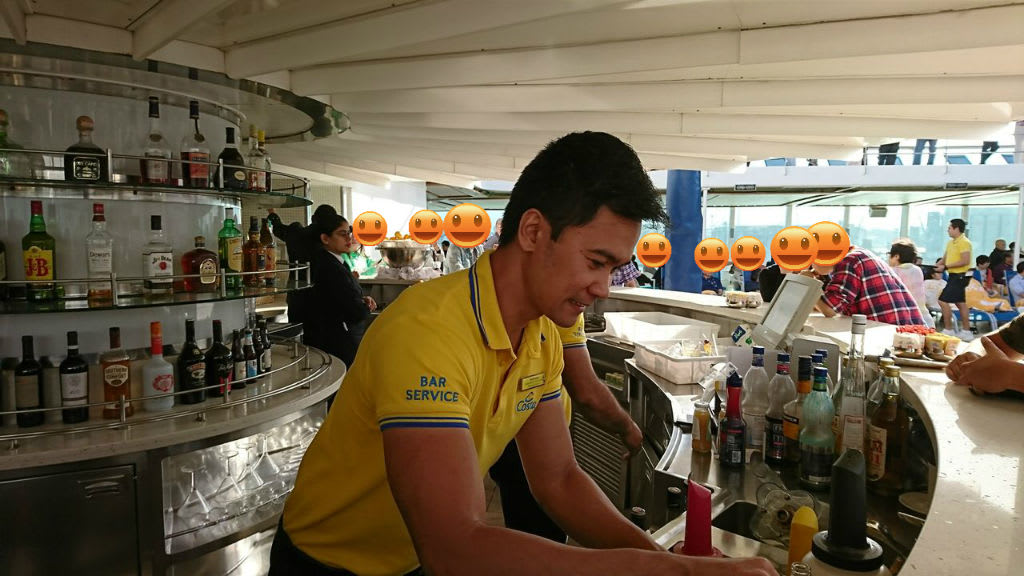 そして、この福岡から乗船した人たちがたくさんいるため、バーテンのスタッフはきりきり舞いの忙しさ。それでも笑顔で対応したり、気が効いたり、彼らもかなりベテランなんでしょうね。素直にすごいです。