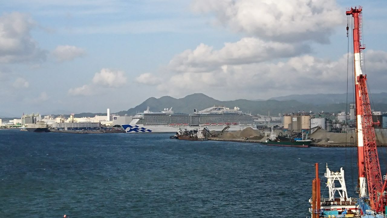恐らくですが、船の形状から考えるにプリンセス・クルーズ社が所有する「マジェスティック・プリンセス」と思われます。長さ330メートル、排水量143,000トン(!)の巨大な船です。