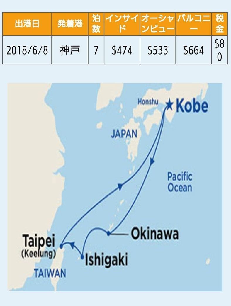 個人的に行きたいなぁ。と思ったのは神戸を出港し、那覇→石垣島→基隆(キールン)→神戸というクルーズ。前回よりも長い1週間の航海で、1日中海の上にいる終日航海日が3日もあります。コスタ・ネオロマンチカの時は、もっと船を楽しめる時間があればなぁと思っていたので、これならたっぷり楽しめる!!