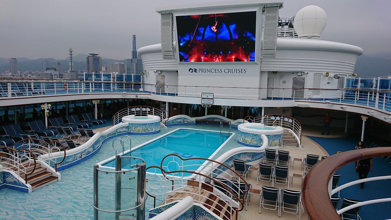 クルーズ船といえば、プールは定番設備ですが、ダイヤモンド・プリンセスには大小4つのプールがあります。こちらのプールは船体中央部にある「ネプチューン・リーフ&プール」です。