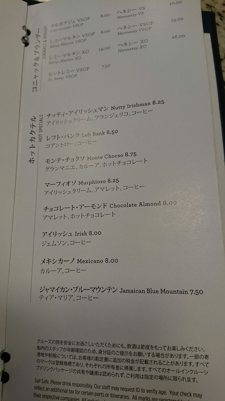 前回は人生初のクルーズだったので、感覚がわからなかったんですが、1日平均で考えると、カクテル3杯くらいに、ソフトドリンクやコーヒーをそこそこ飲むかな?くらいが自分のペースだということがなんとなくわかりました。どっちか言えばコーヒーにほうがよく飲むかも。