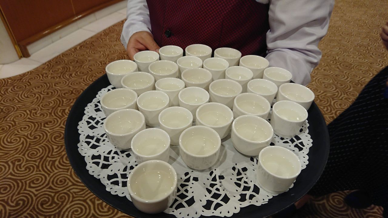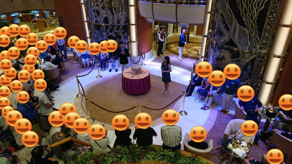神戸港からの出港時刻が刻々と迫る中、中央のアトリウムでは日本酒での鏡開きイベントの開催が行われるため、続々と乗客の方々が集まってきています。