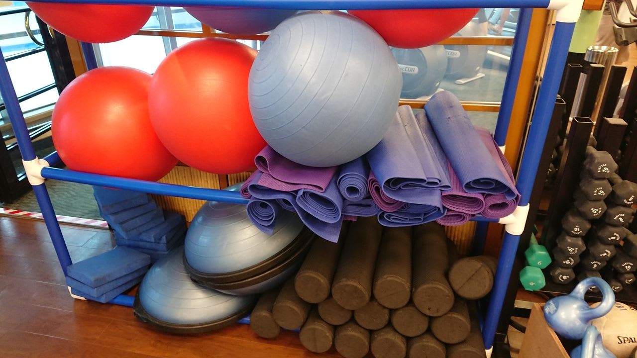 ジムにはマシンがあるエリアと、器具のないエリアに別れていて、健康器具の貸し出しや、ヨガマットも貸し出しがありました。もちろん無料です。