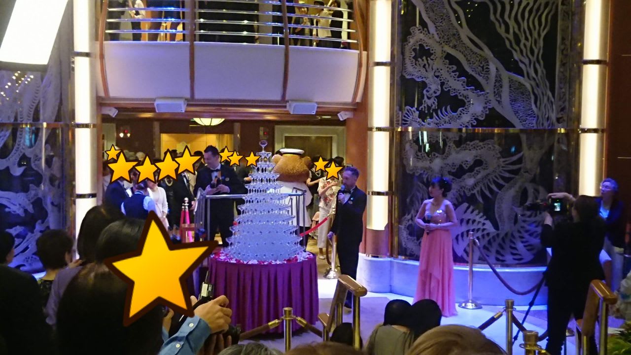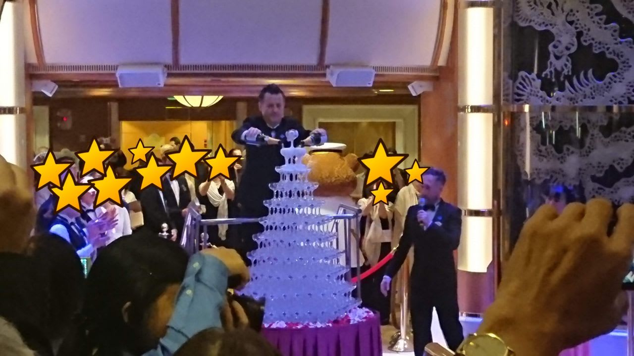 このシャンパンタワーイベントは、「我が社の船はシャンパンタワーができるくらい揺れません!!」というプロモーションの意味合いもあるそうです。