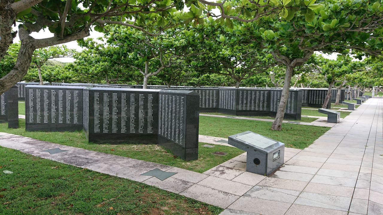 公園に並ぶ石碑には、沖縄戦で死亡した方々の名前が刻まれています。