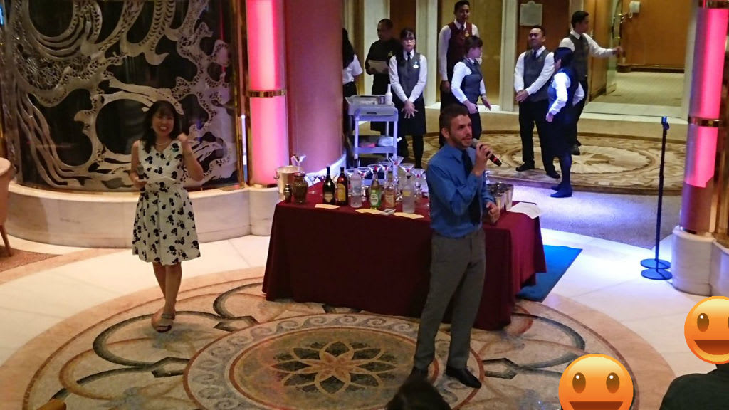 隣にいたクルーズスタッフのブライアン君と一緒に元気に返事をしていたのは私です。
