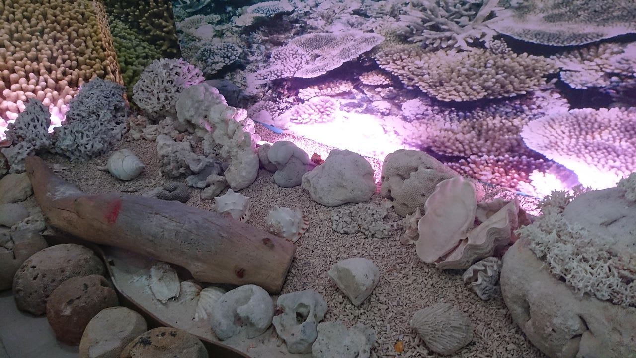 順路に従って歩いていくと、まずは屋内展示で、珊瑚や貝殻・化石等が展示されています。