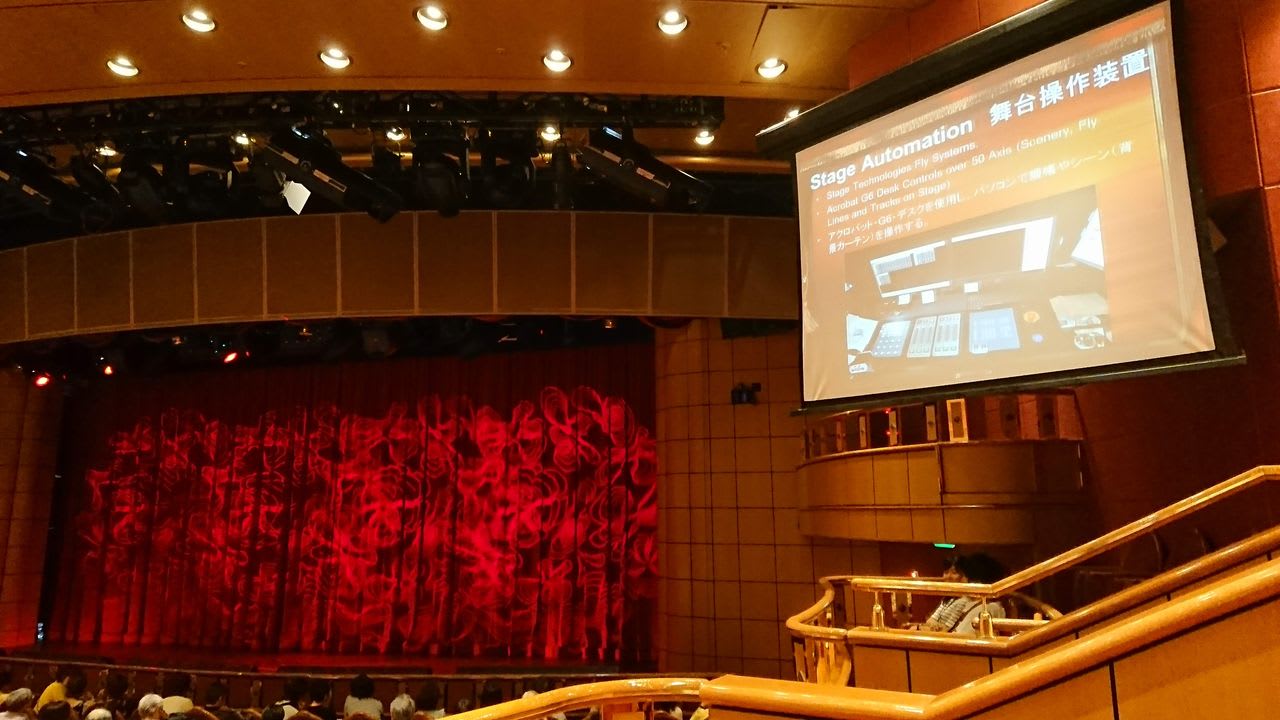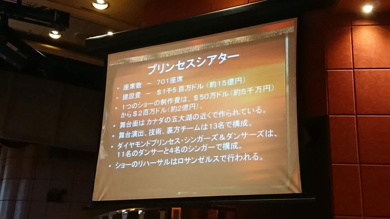 プリンセス・クルーズのアトラクションスタッフと、通訳のためのディレクターのミキコさんが登場。まずは、劇場の舞台装置の解説が始まります。