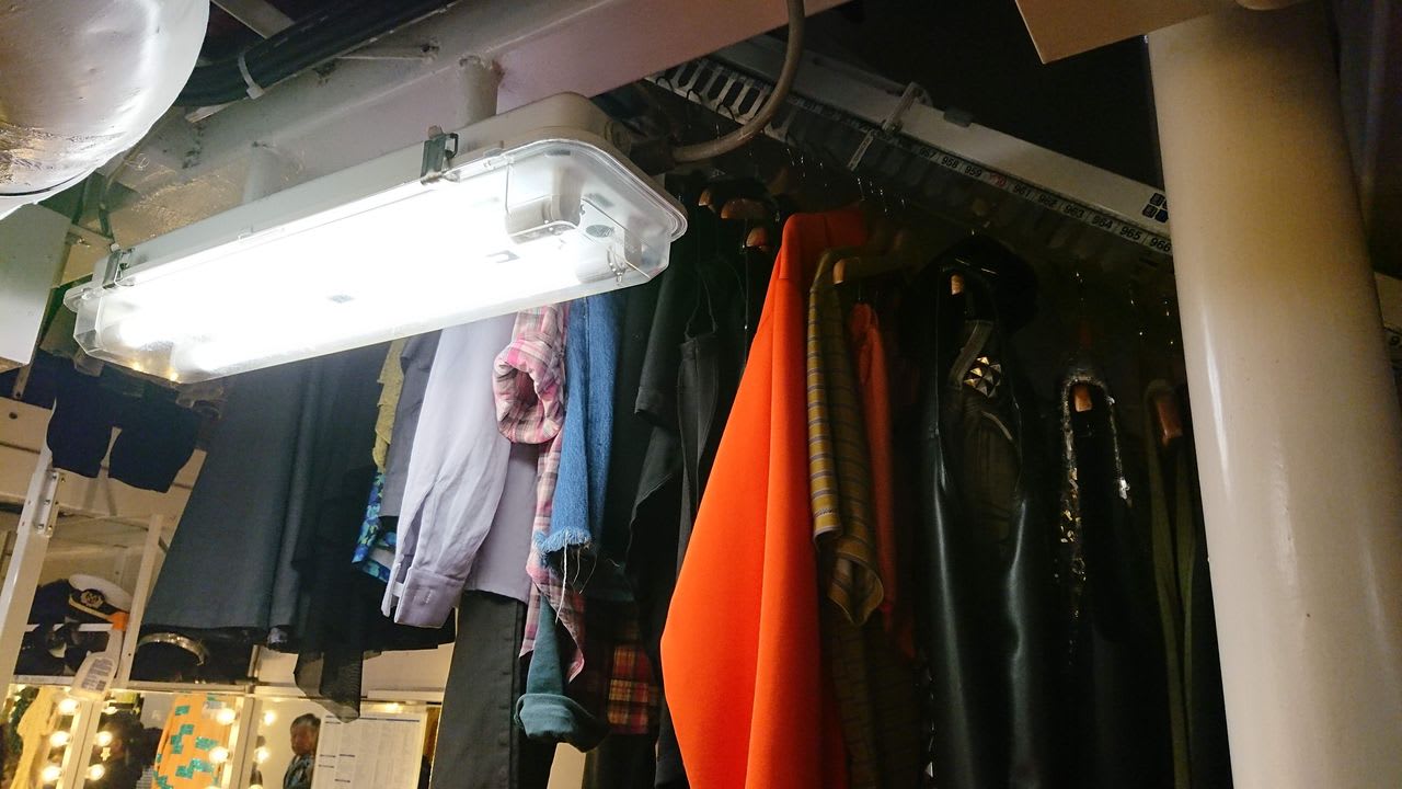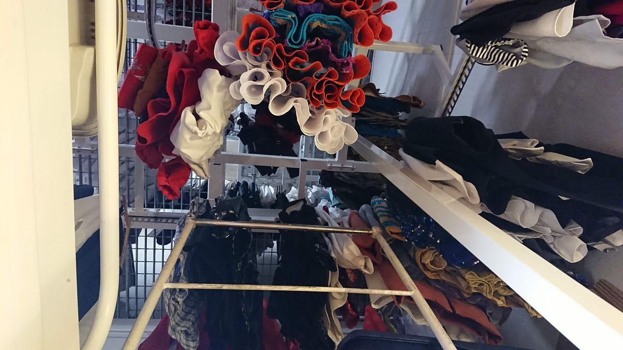 スキー場のリフトのように楽屋の天井に吊り下げられてたくさんの衣装が保管されています。