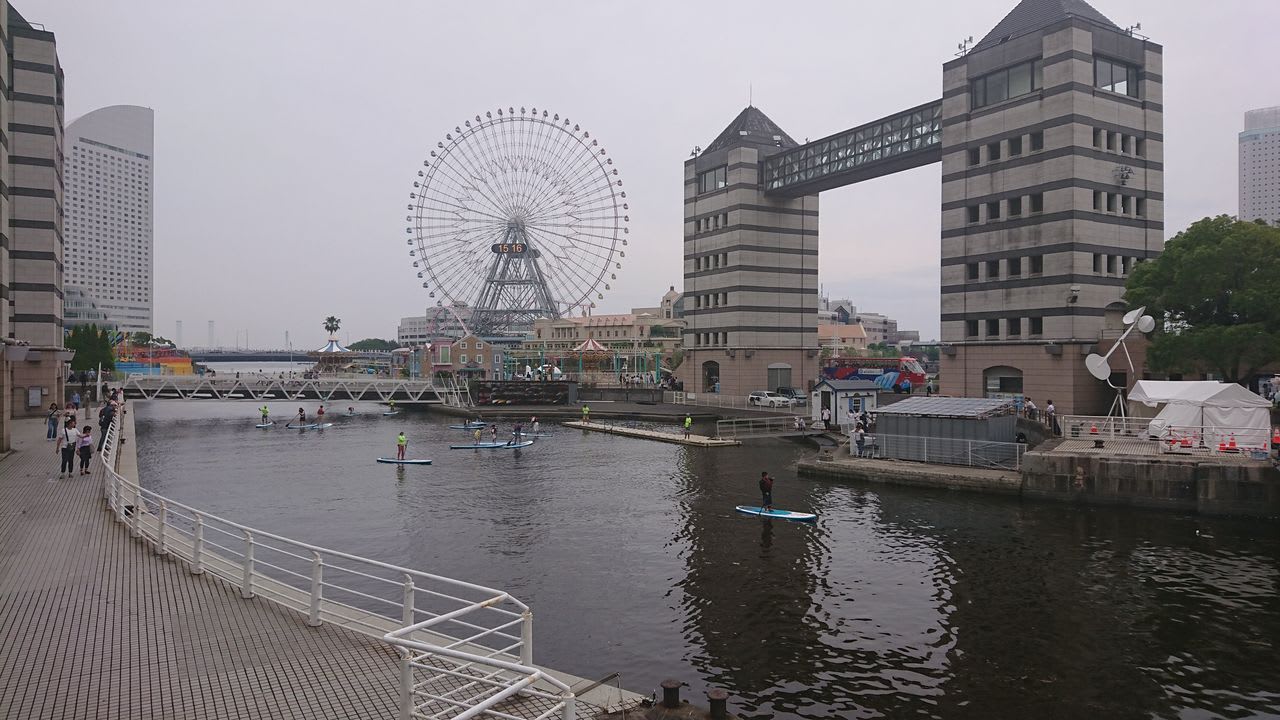 日本丸から少し進むと、今度は運河をサーフボード(?)のようなものを立って漕いでいる人たちがいました。転ばないんですかね?