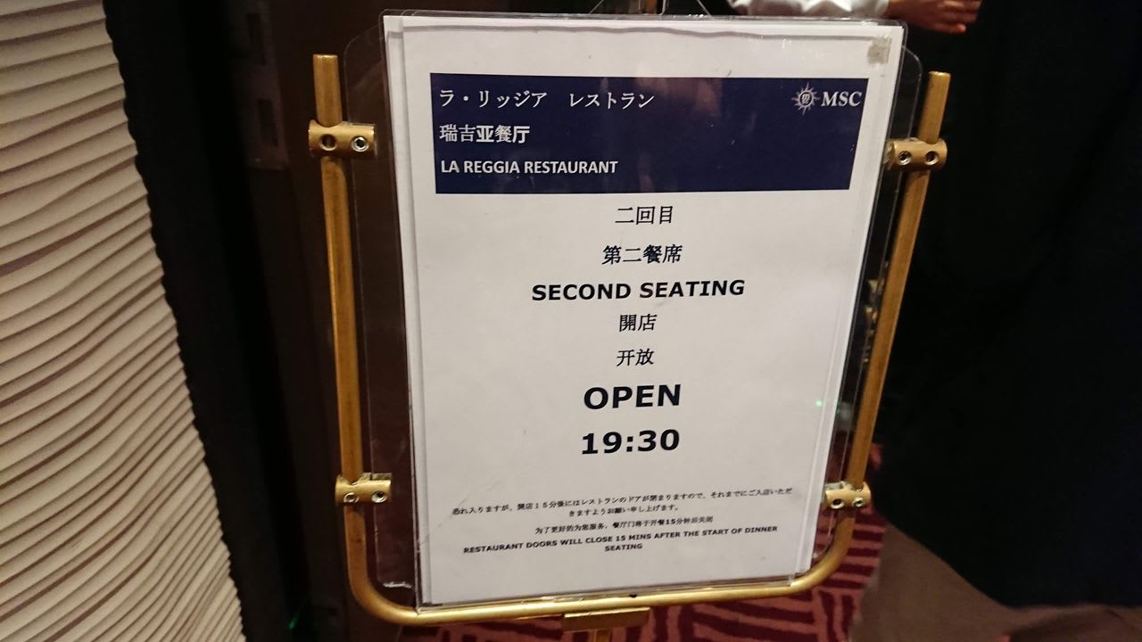 今回も予約時にクルーズブラザーズさんにお願いして、セカンドシーティング(2回目のディナータイム)に指定してもらいました。これは今までの経験から、2回目のディナータイムのほうが船内での予定を組みやすい気がするためです。