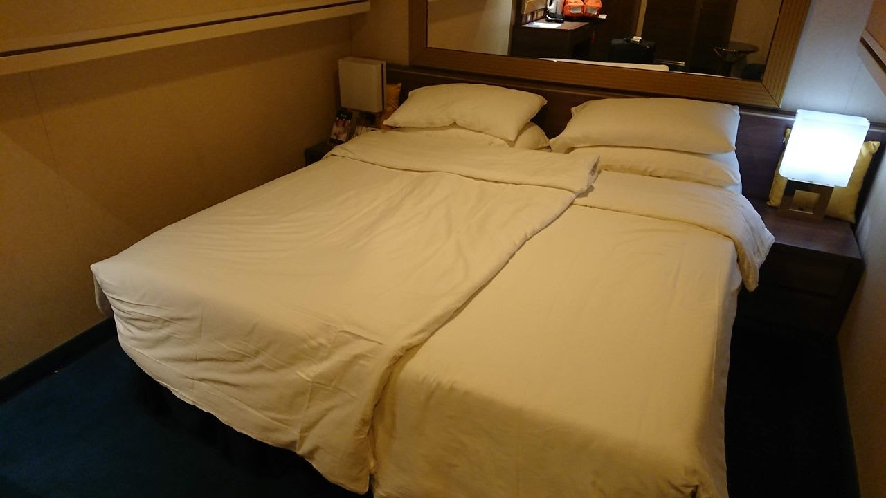 部屋係のスタッフにお願いして、ベッドはくっつけてもらいました。