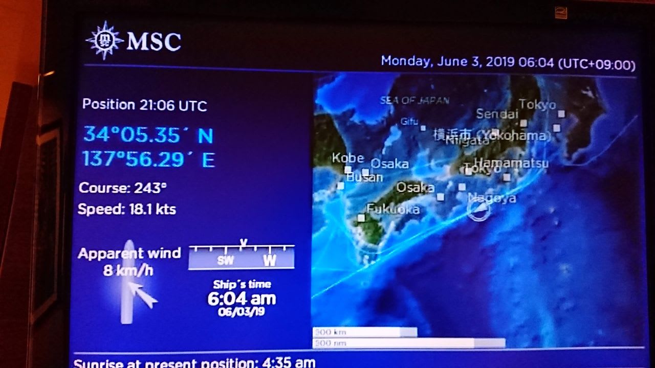 部屋にあるテレビを点けて現在位置を確認すると、現在は浜松市の沖合いを航行しているようです。