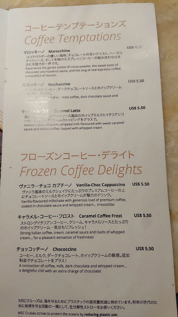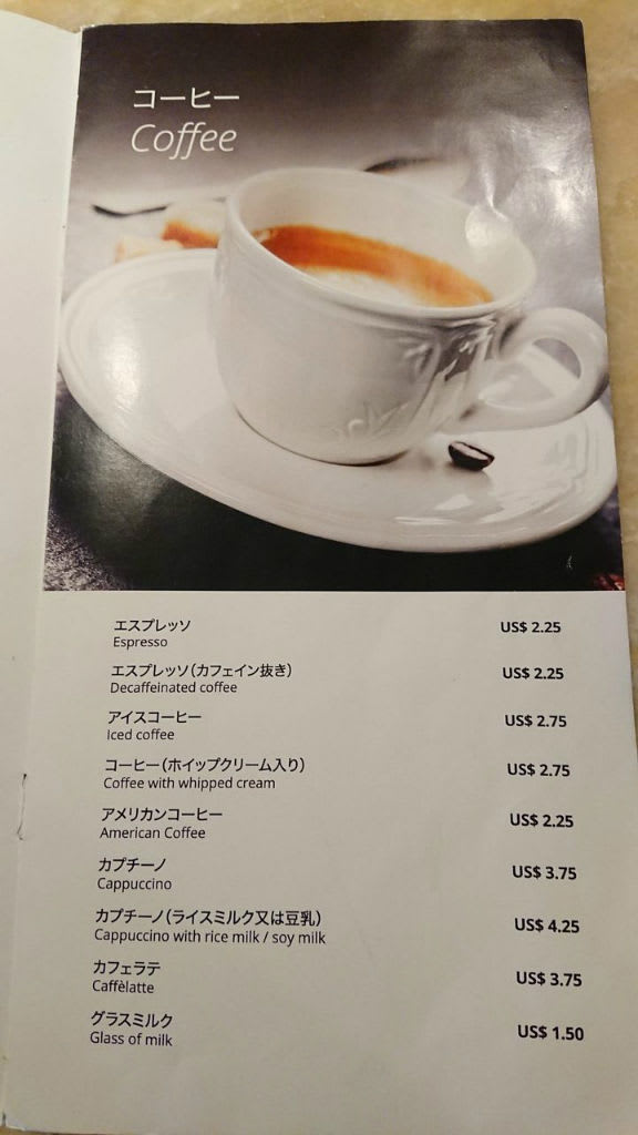 こちらのドリンクはコーヒーを中心に、スターバックスのようなメニューがふんだんに用意されています。もちろんプレミアム・ドリンクパッケージならこちらも飲み放題の対象になります。