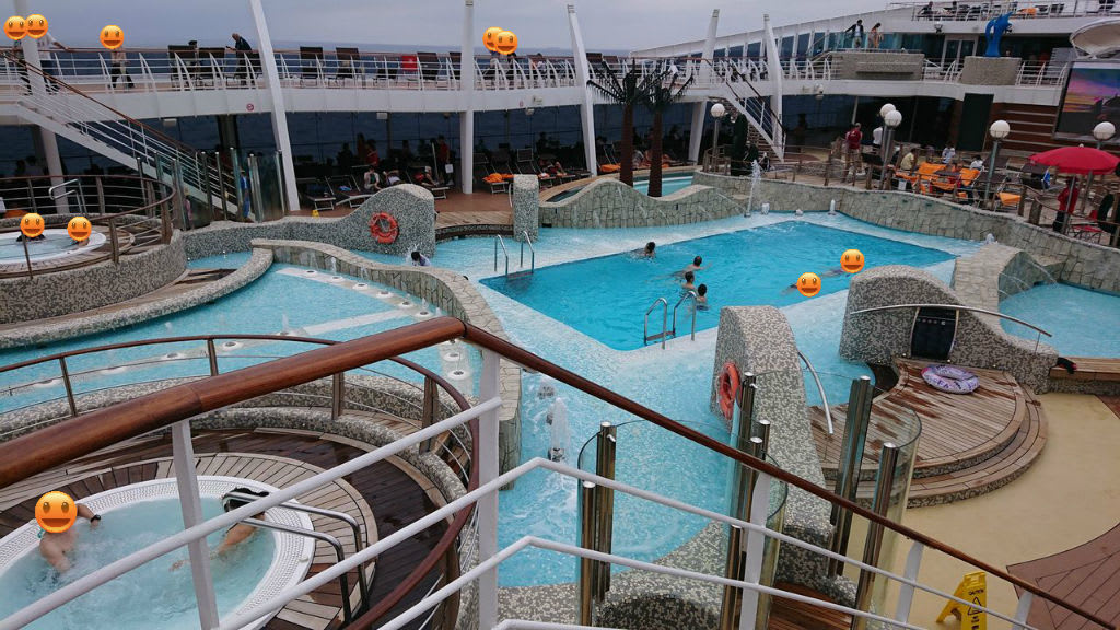 デッキ14まで上がると、暖かい陽気も手伝って、プールは大賑わい!!