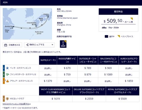 こちらはMSCの公式ホームページの料金表ですが、2020年の6月17日に大阪~上海の6泊7日の往復クルーズでインサイドキャビンは679ドル、バルコニー付きキャビンは969ドルですが、MSCヨットクラブなら1619ドル~になっています。