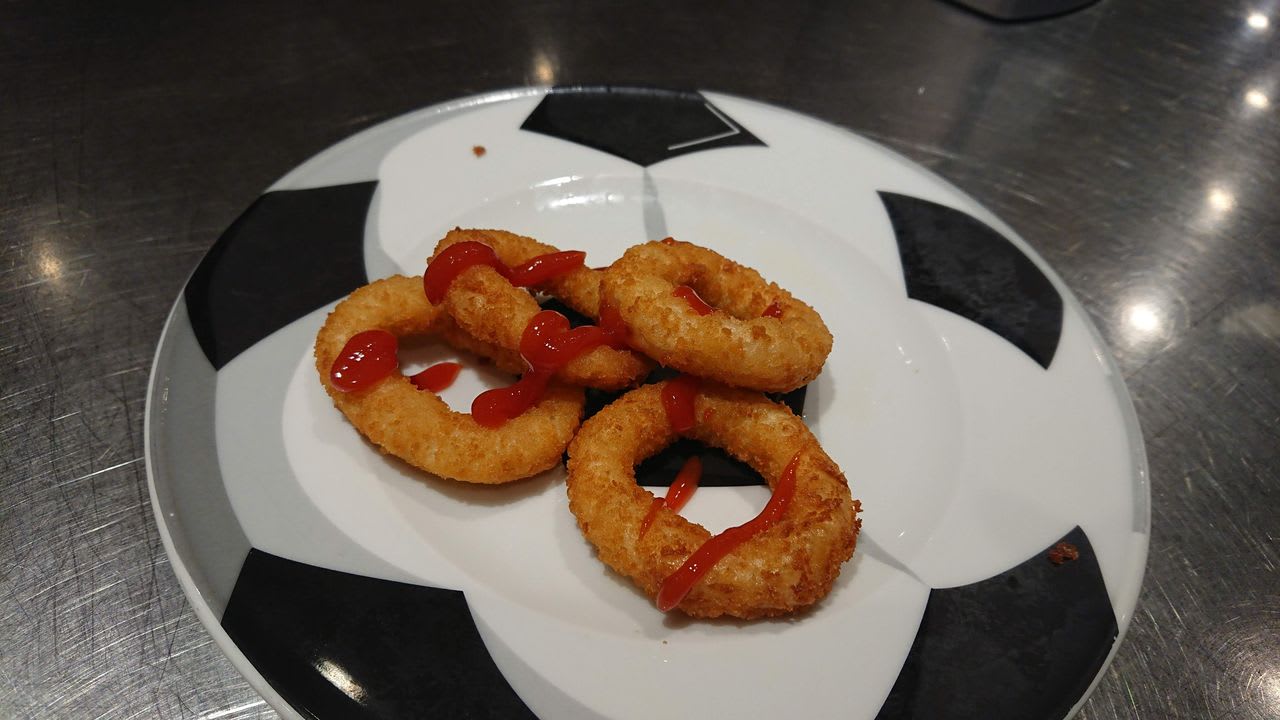飲み物は他のバーとだいたい同じ感じですが、こちらのバーのオリジナルメニューとしてハンバーガーやホットドッグなどの軽食があるんですよね~。こちらがかなりおいしいとの前評判だったんですが、今は夕食前・・・。でも気になるのでオニオンリングを注文。