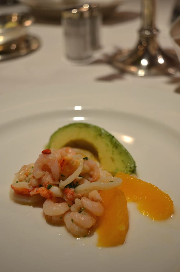 ロブスター、小エビ、イカのオレンジ果肉とライム、コリアンダーのビネグレットソース添え