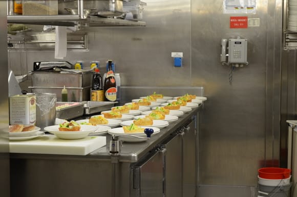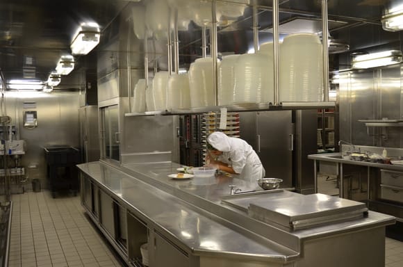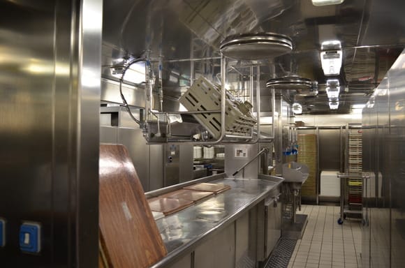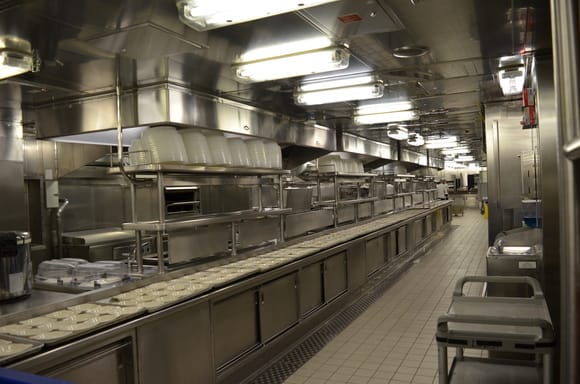 お船の一番前のプリンセスシアターから最後尾のインターナショナルダイニングに移動して、そちらから厨房に入ります。