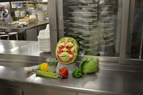 この時の乗船客は2500人位だったそうですが、この2500人分のランチの後は、1100人のクルーのごはんタイムとなるそうです。
