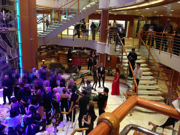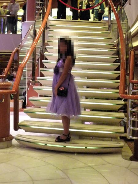 その前で記念撮影した後は、アトリウムの階段でお船のカメラマンが写真を撮ってくれますので(後で購入します)それに並んで、娘と私の記念写真を撮ってもらいました。