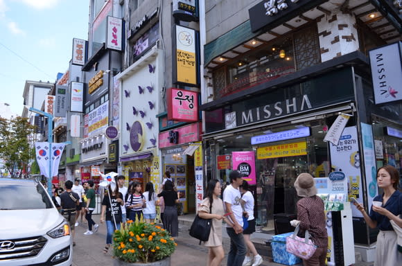 お化粧品のお店がたくさんあって、ものすごい呼び込みをしているお店もあり。
