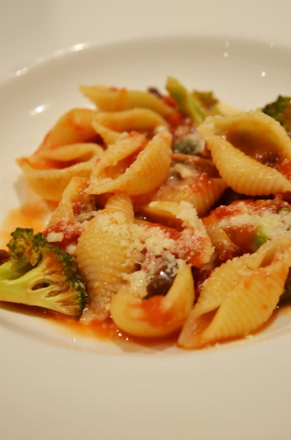 貝殻の形をしたパスタにマリナラソースブロッコリー、ケイパーオリーブを加えて。オプションで焼いた鶏肉も追加できます。