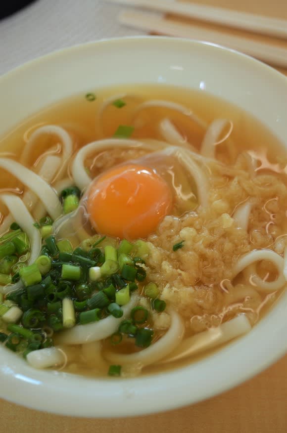 桜島へのフェリーの中で食べたのが月見うどん 500円。
