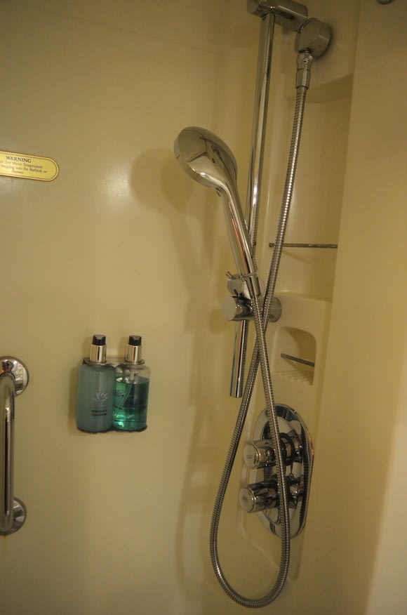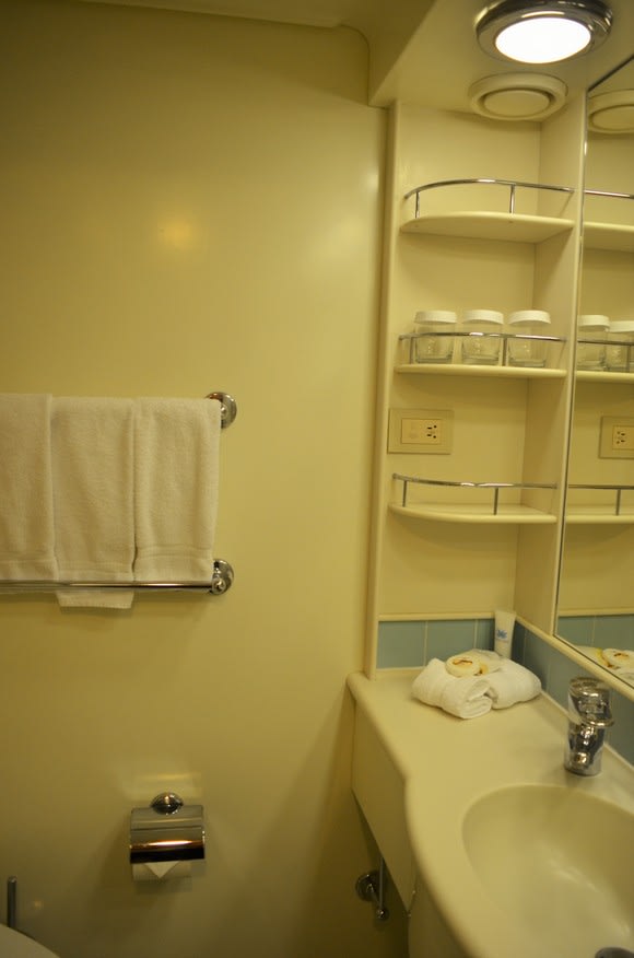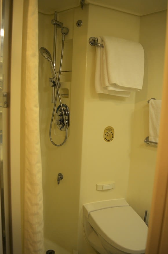 バスルームのドアをばっと開けると、まぁ内側キャビンのバスルームとほぼ同じ。