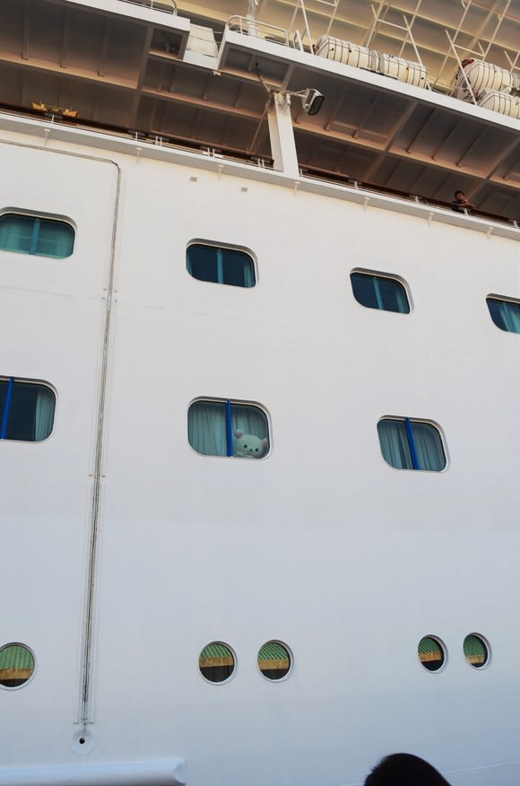 寄港地で、外から自分たちのキャビンがすぐわかるように、ちょっと仕掛けをしておきました。