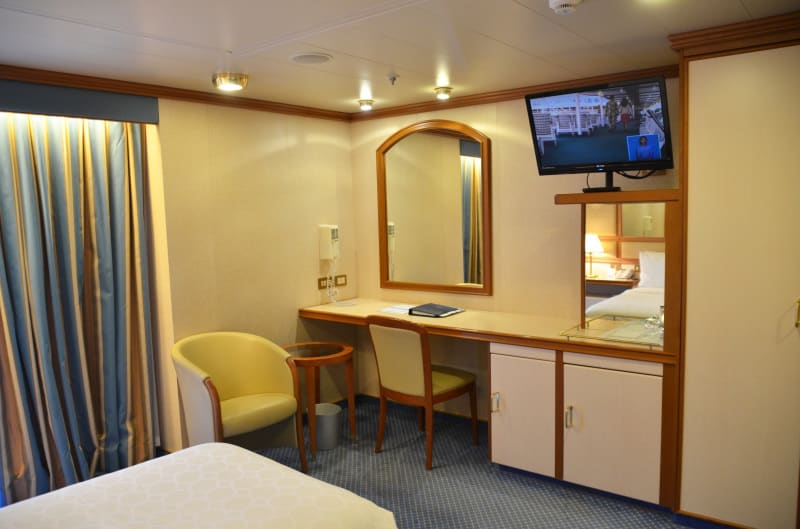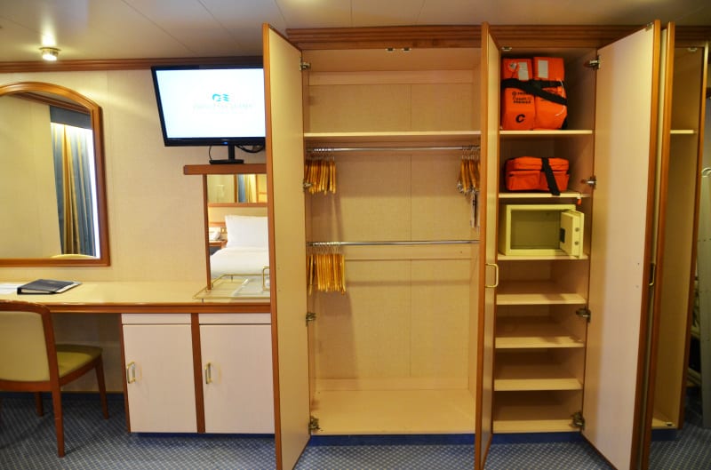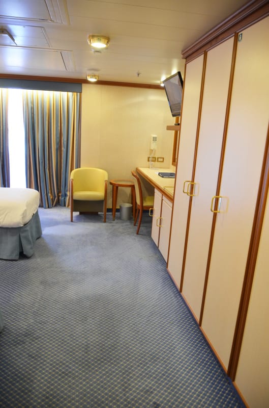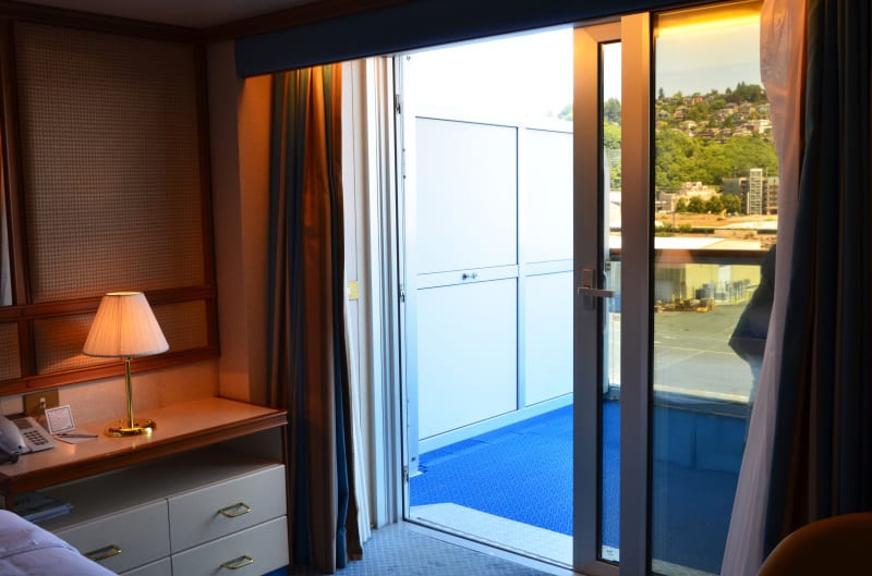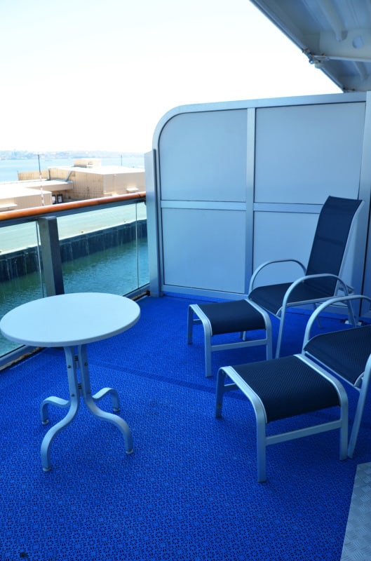 われわれはカリブデッキ、10階でした。下はドルフィンデッキ、ミニスイートのフロアーで広いです。そのドルフィンデッキのバルコニーの屋根にあたる部分が10階カリブデッキのバルコニーですので、11階バハデッキより上のデッキのバルコニーより奥行きが広いバルコニーです。更に、このキャビンは幅も広いので、かなりゆったりしたバルコニーでした。