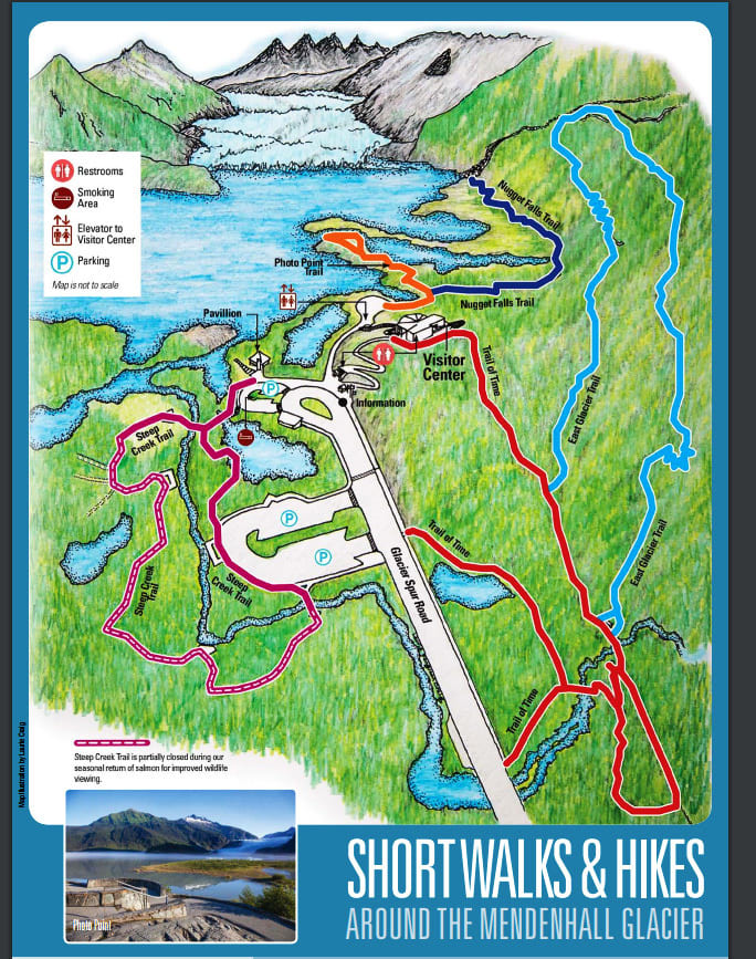 この便利な地図を見てみますと、メンデンホール氷河周辺にはいろんなトレイルコースがあるようです。