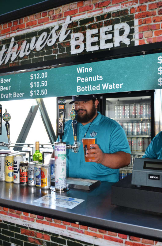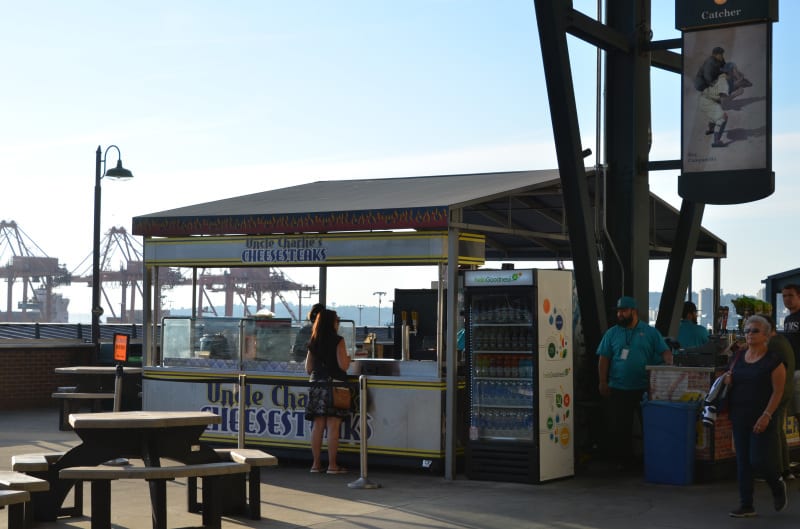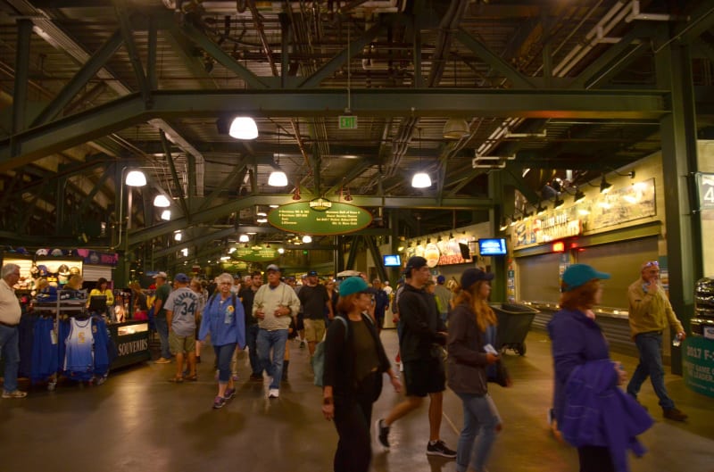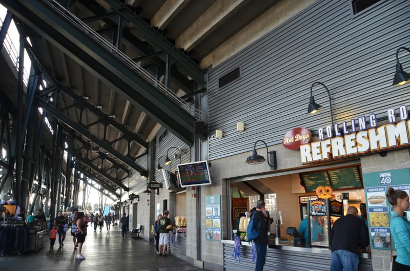 観客席の裏側はこんな感じで、食べ物屋さんがずら~~っと並んでいます。たいがいがホットドッグやプレッツェル、ポテトにポップコーンなど、アメリカーンなものです。