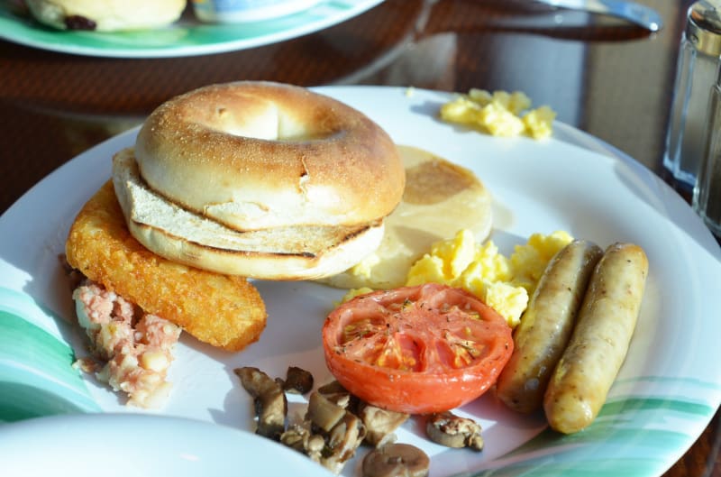 ベーグル、ソーセージ、焼きトマト、ハッシュブラウン、コンビーフポテト、スクランブルエッグ。
