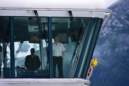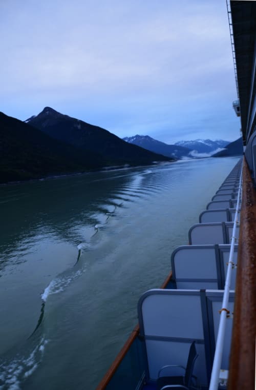 アラスカ犬と触れ合ったり、夜のショーの一回目を見たりして、そろそろディナーのお時間ね~という頃、出航しました。